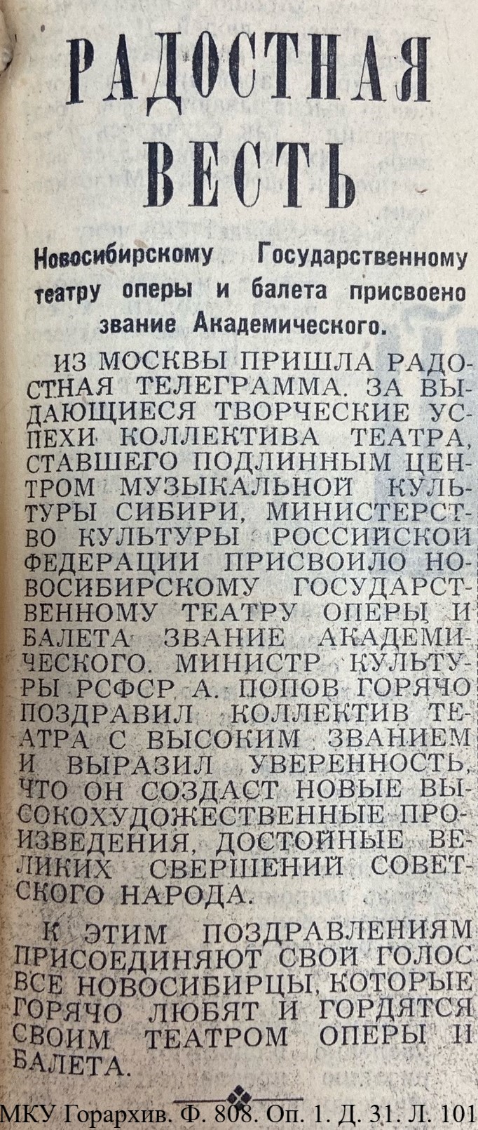 60 лет назад (1964) газета «Вечерний Новосибирск» опубликовала сообщение о присвоении звания академического Новосибирскому государственному театру оперы и балета (ныне – НГАТОиБ, НОВАТ).