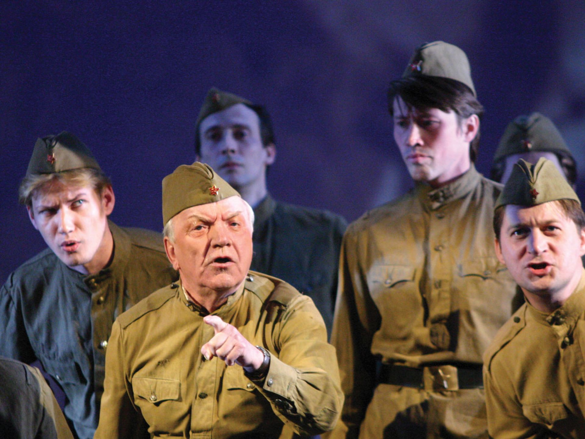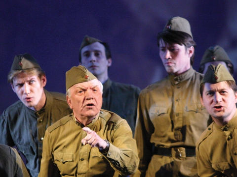Сцена из героической музыкальной комедии А. Новикова «Василий Тёркин». Иван Ромашко и артисты хора театра. Фото Дмитрия Худякова