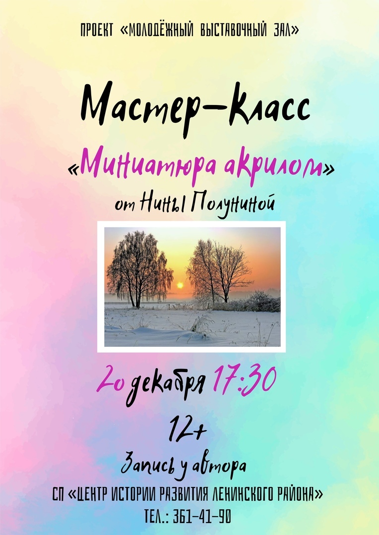 в 17:30 начнётся мастер-класс «Миниатюра акрилом» от художника Нины Полуниной (предварительная запись у мастера обязательна);