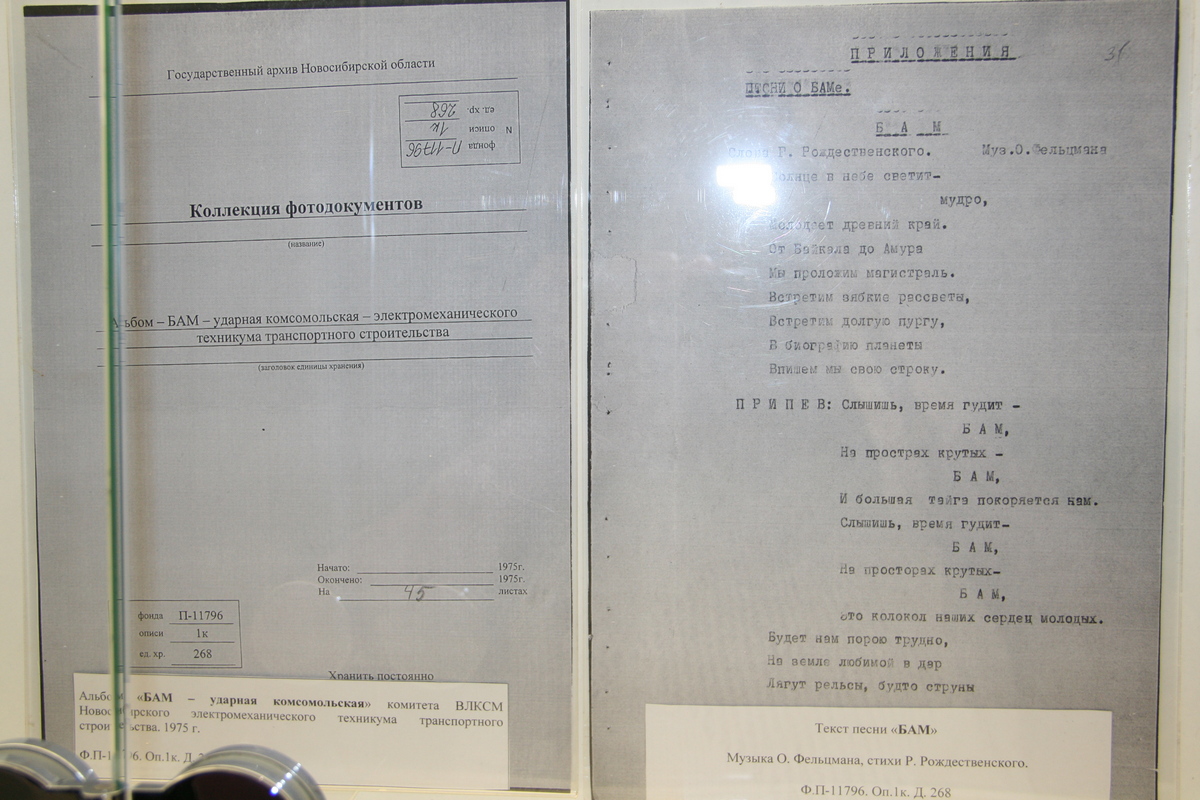 В ГАНО находятся на хранении авторефераты диссертаций, комплексные планы о создании продовольственной базы в зоне освоения БАМ. В разработке планов участвовали СО РАН, его академические институты, ВАСХНИЛ. Новосибирцы и Новосибирский институт инженеров железнодорожного транспорта принимали участие в строительстве восточного участка БАМа. Поэтому в архиве находится много документов и уникальных фотографий именно с этого участка БАМа.