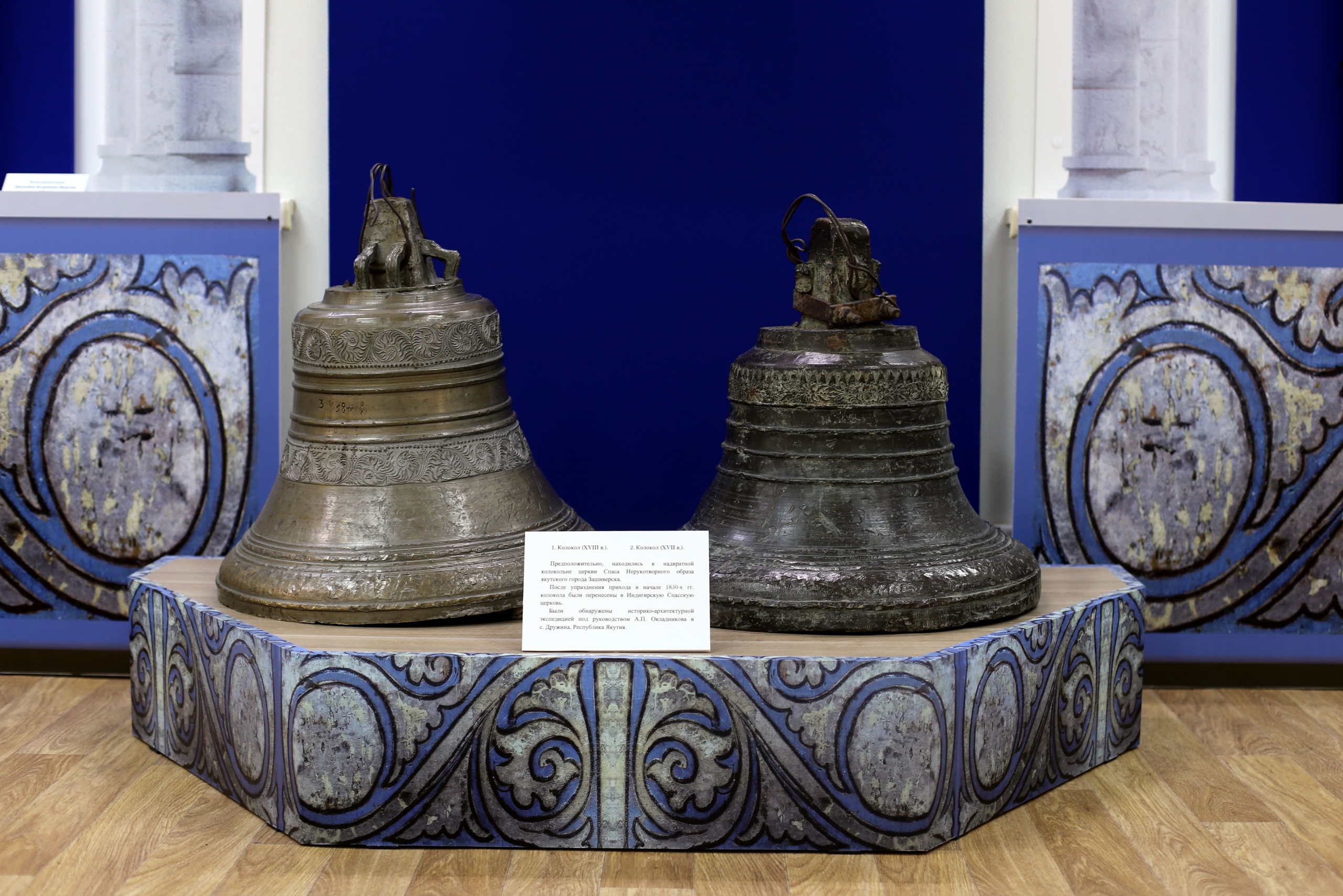 Среди экспонатов выставки — бронзовые колокола, предположительно располагавшиеся на звоннице Спасо-Зашиверской церкви 1700 года постройки, перевезённой из Якутии в Новосибирск в музей под открытым небом.