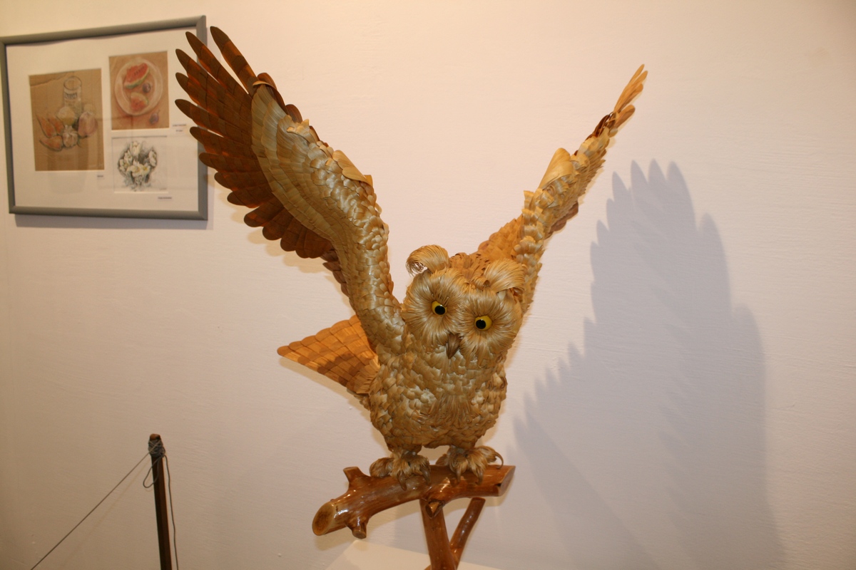 В зале музея представлено и одно из первых изделий автора – сова, которая положила начало коллекции необычных зверей и птиц.