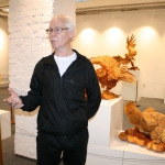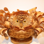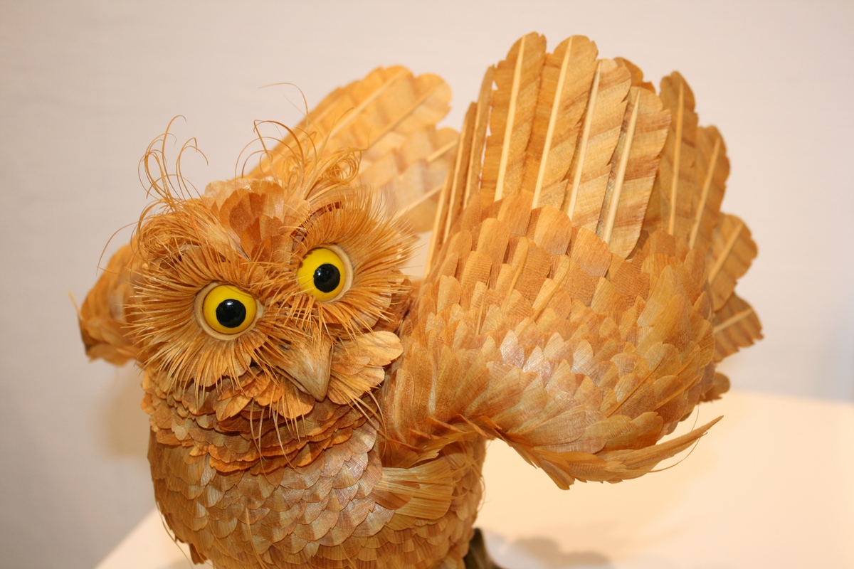 На мастер-классе скульптор познакомил посетителей выставки с азами своего творчества – показал, как делается перышко птицы. Разрезаешь заготовку древесной стружки пополам, склеиваешь половинки столярным клеем и катаешь круглой палочкой. Перышко готово!