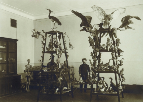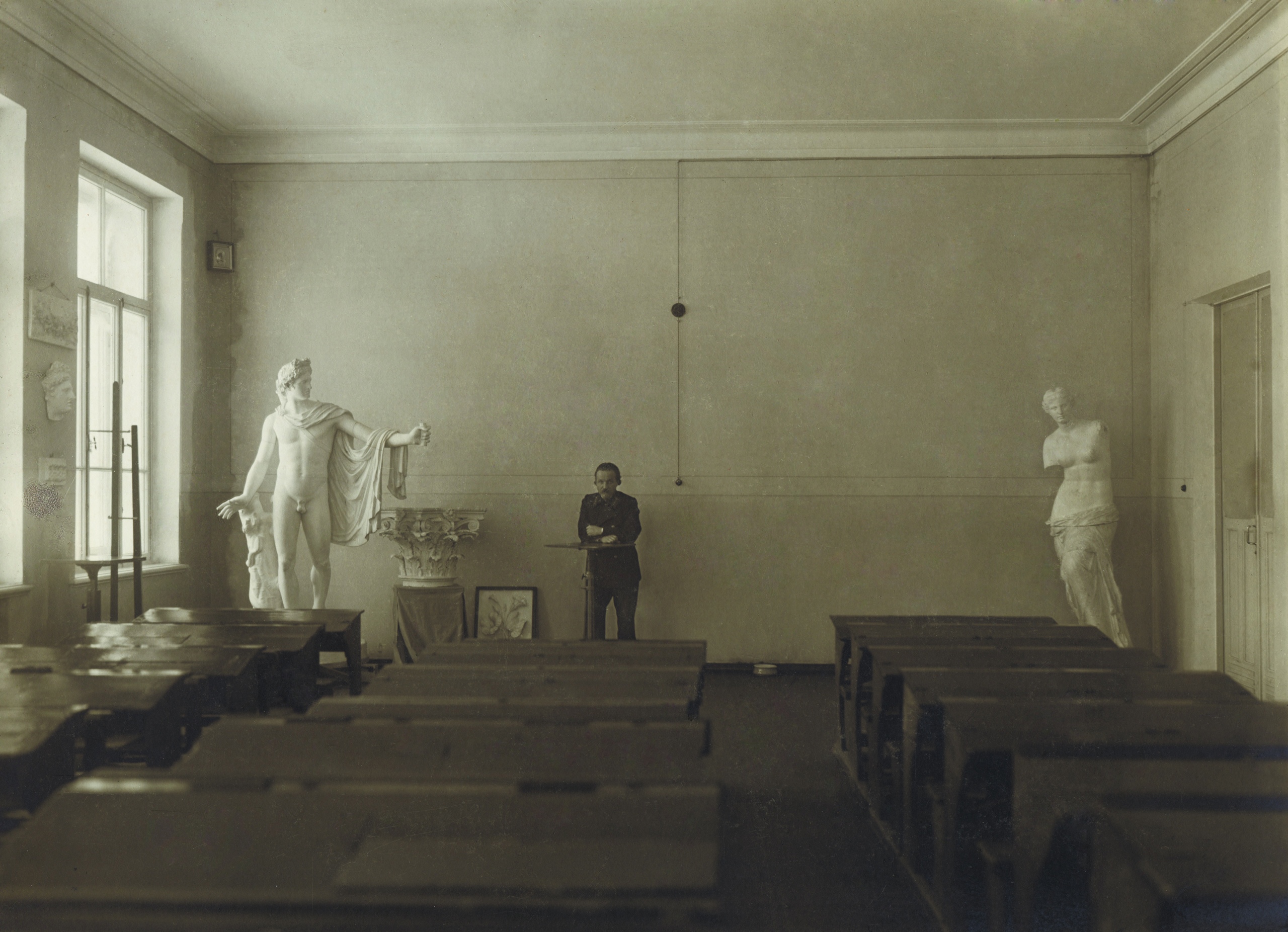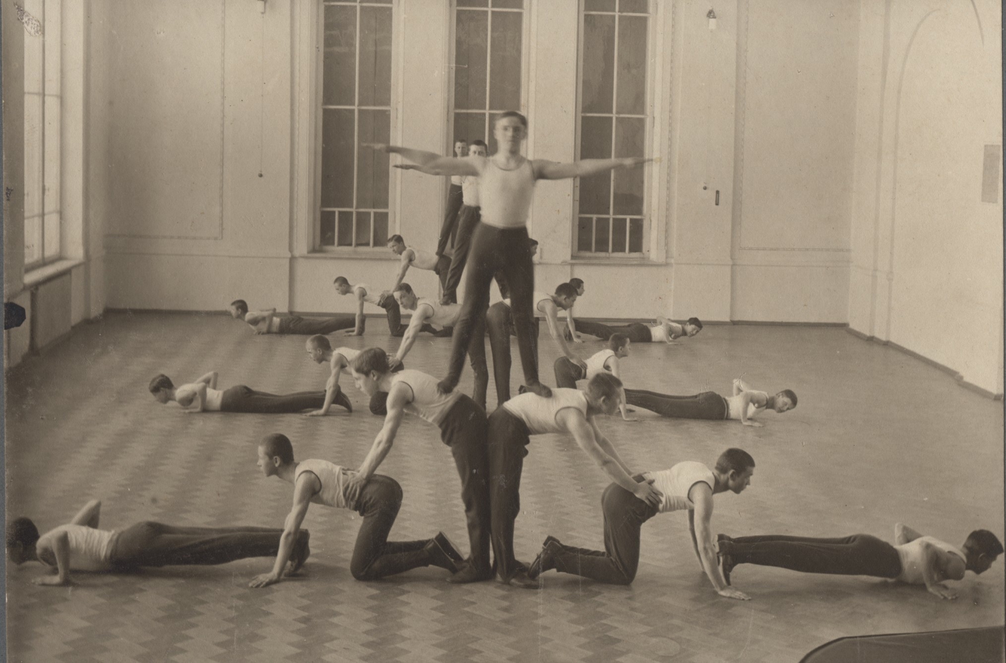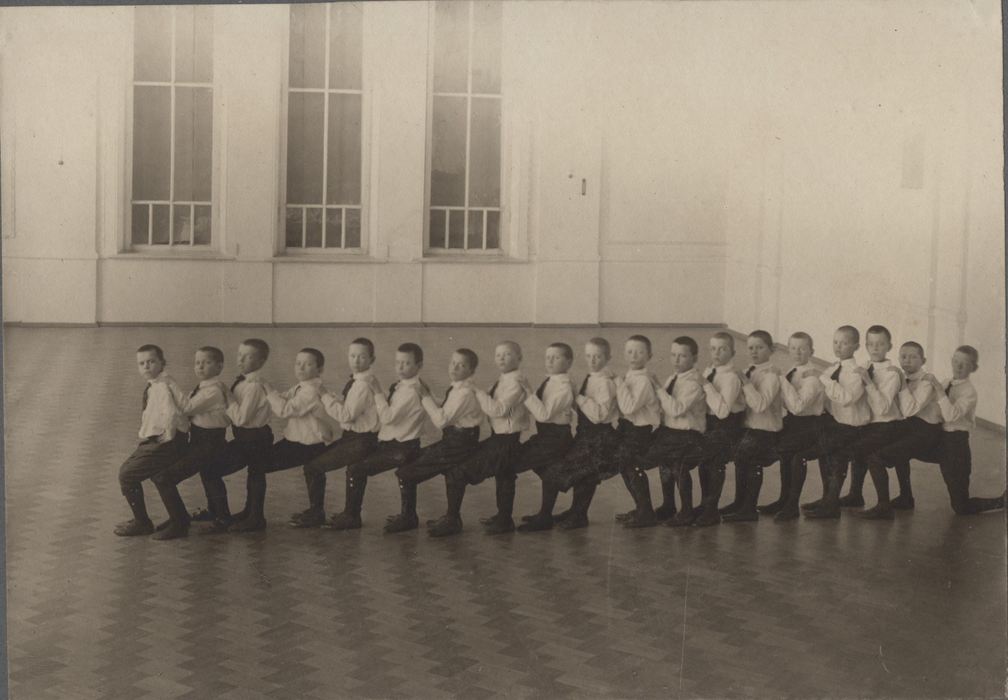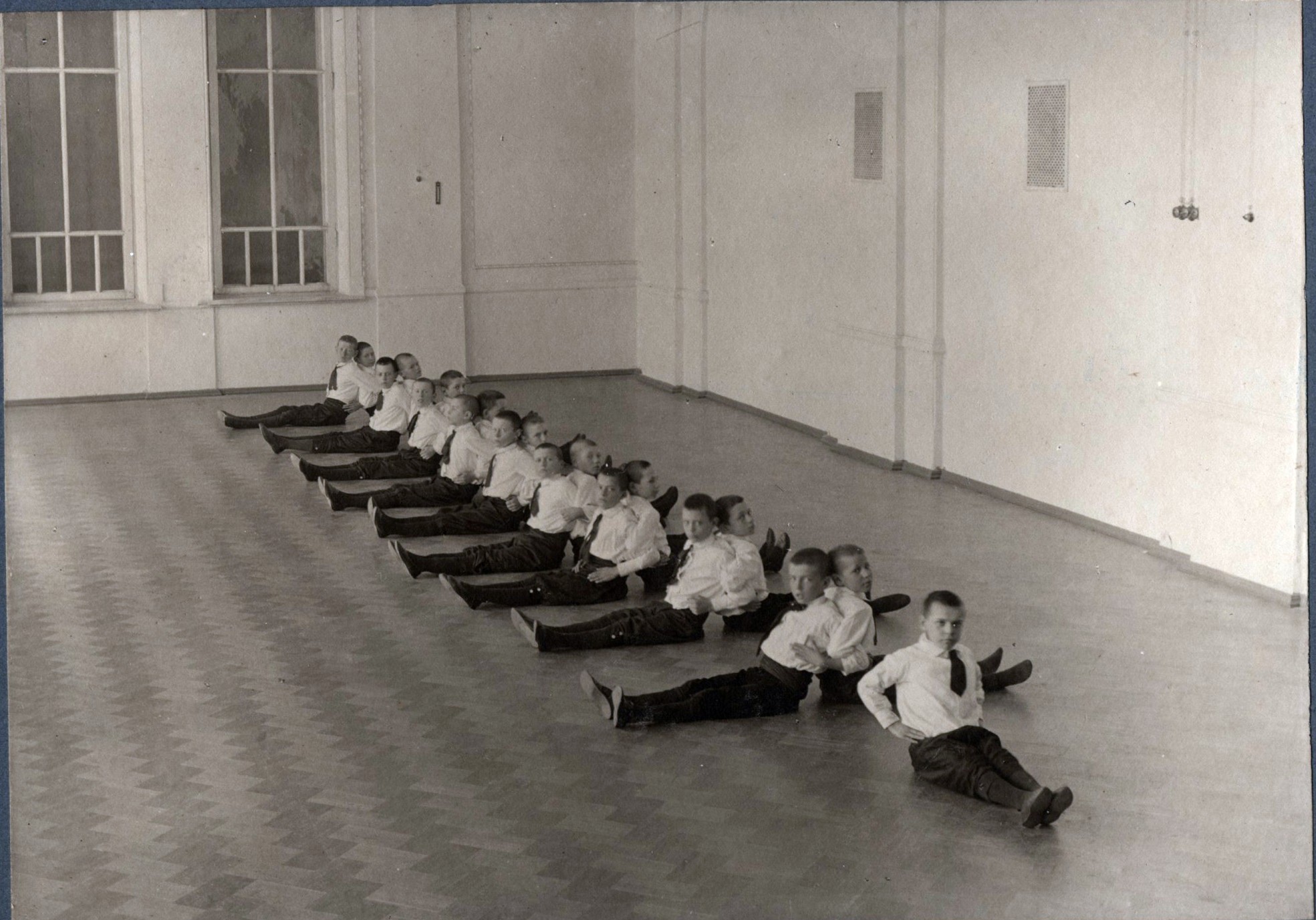 На этих фотографиях вы можете увидеть, как проходило обучение в 1913 году: как выглядели класс рисования и кабинет естественных наук, как ученики занимались сокольской гимнастикой в гимнастическом классе. Сокольская гимнастика была широко распространена в дореволюционной России. Особое внимание уделялось групповым упражнениям и поддержкам, работе со спортивными атрибутами.