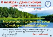 Городской Центр истории Новосибирской книги имени Н. П. Литвинова приглашает 8 ноября в 17-00 часов на празднование Дня Сибири.