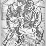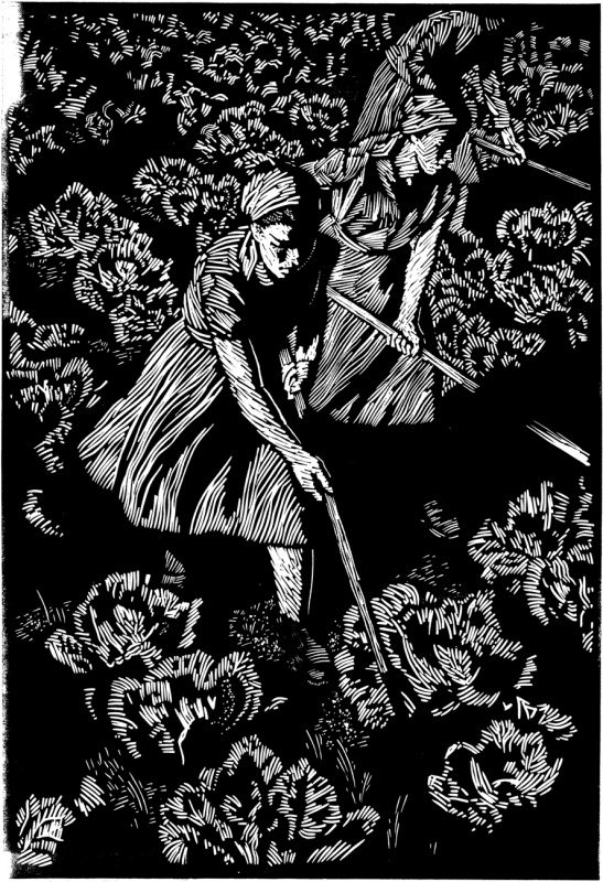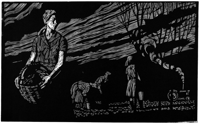 В линогравюрах Николаева доминирует чёрный фон, из которого словно вспышками света выхватываются лишённые чётких контуров усталые, сосредоточенные лица, натруженные руки. Толстая, грубоватая штриховка, создающая эти объёмы, хранит следы напряжённого движения резца. Характер штриха заметно различен: фигуры среднего плана передаются более узкой, аккуратной штриховкой, дали – длинной, тонкой, плавной, а предметы, травы – совсем мелкой, вибрирующей, легкой.