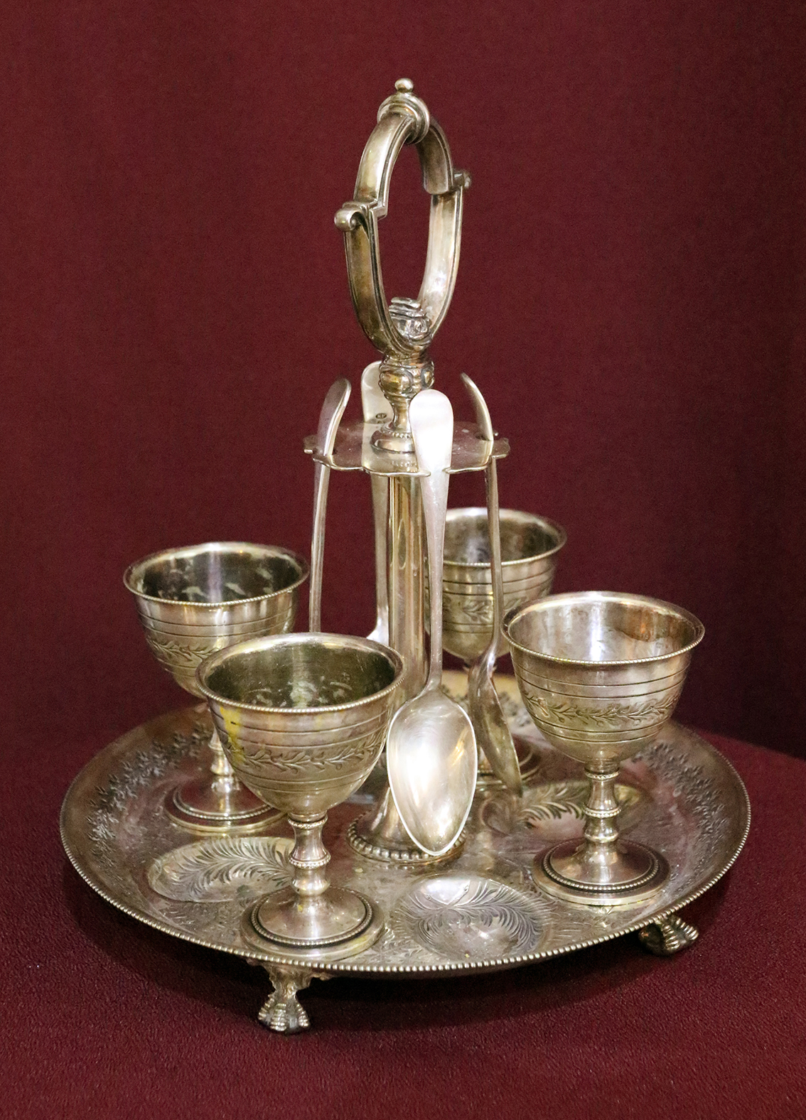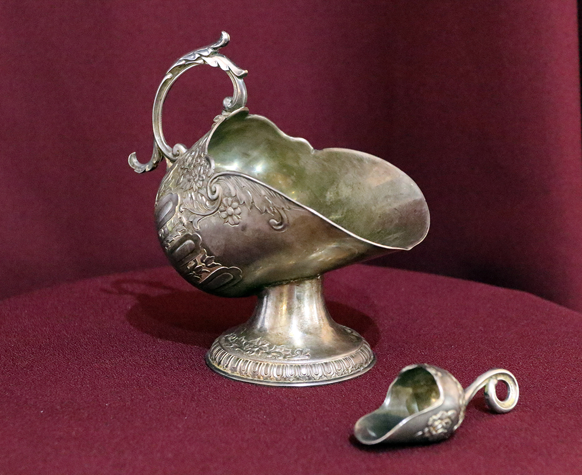 Экспозиция составлена из более чем ста коллекционных предметов сервировки и старинного фарфора. Столовые серебряные предметы с резными цветами причудливой формы позволят наглядно представить красивое застолье наших предшественников столетней давности. Внимания заслуживает анитикварная коллекция серебряный приборов в стиле «хильдесхаймская роза».
