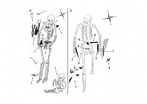 1. Погребения Верхоленского могильника, цифрой 7 на рис. а и цифрой 4 на рис. b показаны костяные игольники, фото ИАЭТ СО РАН