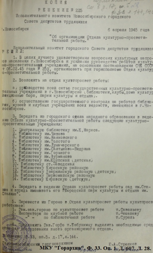 На основании решения Новосибирского горисполкома от 06.04.1945 г. в целях удовлетворения возросших культурных запросов населения г. Новосибирска и усиления руководства работой культурно-просветительных учреждений, в соответствии с постановлением СНК СССР от 06.02.1945 г., при Новосибирском горисполкоме был организован Отдел культурно-просветительной работы.