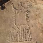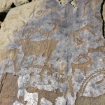3-6. Петроглифы Калбак-Таша: фигура «женского божества» (3), изображения животных (4-5), фигуры в грибовидных головных уборах (6)