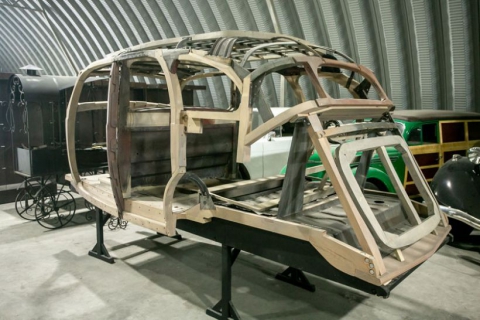 Восстанавливается кузов автомобиля марки ЗИС. Можно заметить деревянные детали, которые стояли на машине изначально (они темнее). Обычно на реставрацию одной машины в среднем уходит от 7-8 месяцев до двух лет, а стоимость работ может превысить полтора миллиона рублей.