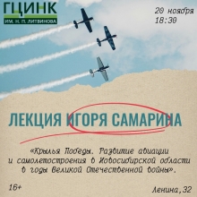 20 ноября в 18:30 в ГЦИНК им. Н.П. Литвинова состоится лекция «Крылья Победы. Развитие авиации и самолётостроения в Новосибирской области в годы Великой Отечественной войны».