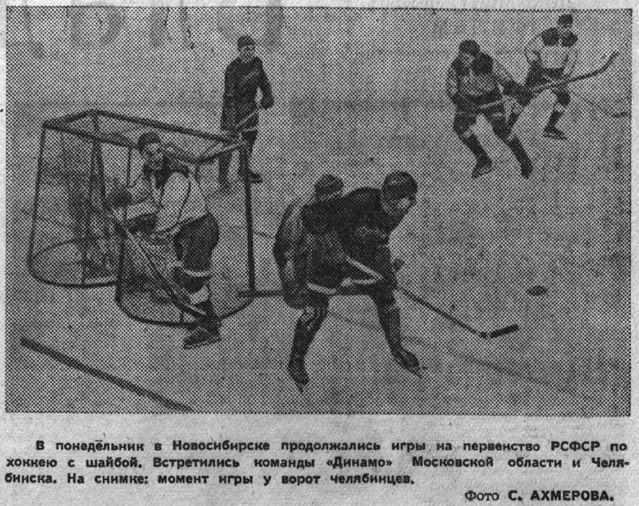 27 февраля в город приходит большой хоккей. Победители пяти территориальных зон съехались в Новосибирск для проведения финала первенства РСФСР по хоккею с шайбой. Более 2000 болельщиков разместились на снежном валу вокруг коробки «Пищевика». Капитан сибиряков, защитник Александр Швецов слегка потянул шнур – флаг соревнований затрепетал в воздухе. Первая игра: «Динамо» (Московская область) – «Динамо» (Новосибирск). И началось. Точный бросок Кузина на второй минуте – гол, через две минуты комбинация Кузьмин-Кузин – гол. У новосибирцев зарабатывает удаление Швецов, следом за игру без клюшки вратарь Судомоев. Но москвичи бессильны. На шестой минуте Исламов-Кузин – 3:0, Архипов – 4:0. Ну, и так далее. Лишь в третьем периоде гости оказались немного сильнее. Бурная игра заканчивается со чётом 10:6 в пользу сибиряков.