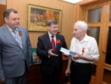 На фото: Александр Филатов (справа) принимает поздравления с Днем Победы от мэра Анатолия Локтя и депутата Рената Сулейманова