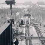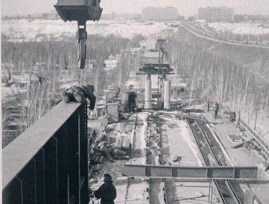* Особый интерес вызывал монтаж пролетных строений метромоста: они сооружались методом продольной надвижки с оригинальной конвейерно-тыловой сборкой. И пассажиры переполненных автобусов, трамваев и троллейбусов ежедневно могли наблюдать за тем, как огромная стальная коробка, общая длина которой составила 860 метров, прогибаясь под собственной тяжестью, постепенно надвигалась над рекой от опоры к опоре.